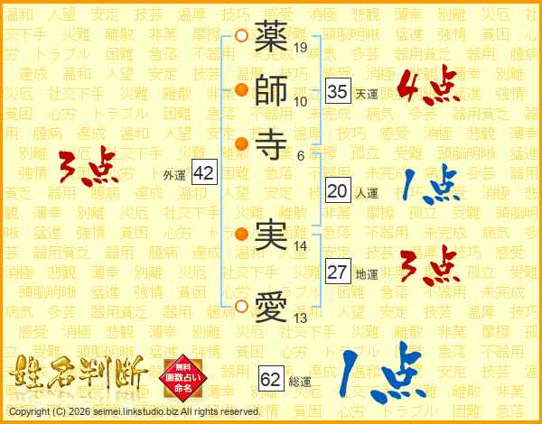 薬(19画)師(10画)寺(6画) 実(14画)愛(13画)