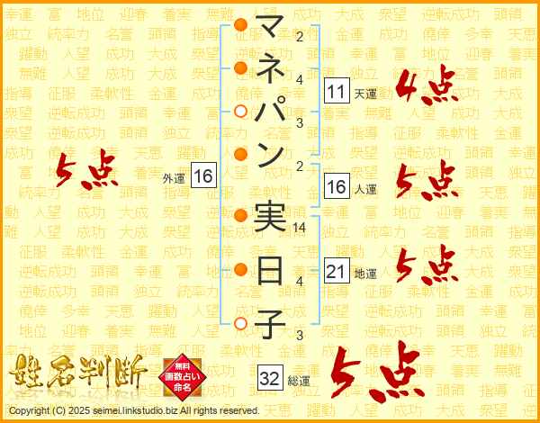 マ(2画)ネ(4画)パ(3画)ン(2画) 実(14画)日(4画)子(3画)