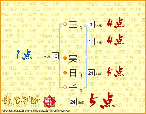 生活面を象徴する運勢です。外部から受ける影響力を表し、結婚運、家庭運や職場、環境への順応性を表します。総運から人運を引いた画数。姓や名が1文字の場合を除く。