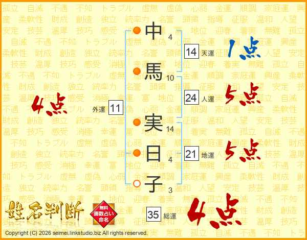 中(4画)馬(10画) 実(14画)日(4画)子(3画)