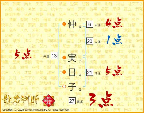 生活面を象徴する運勢です。外部から受ける影響力を表し、結婚運、家庭運や職場、環境への順応性を表します。総運から人運を引いた画数。姓や名が1文字の場合を除く。