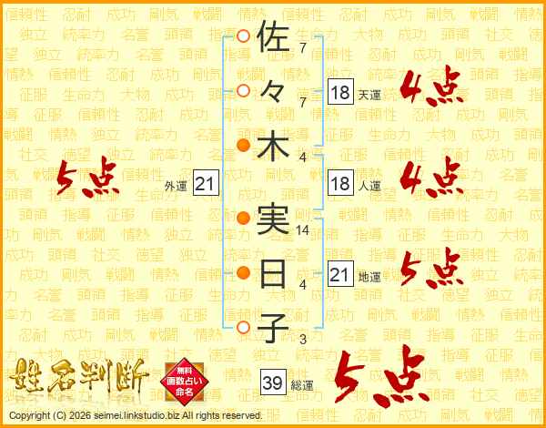 佐々木実日子さんの外運は21画の5点!