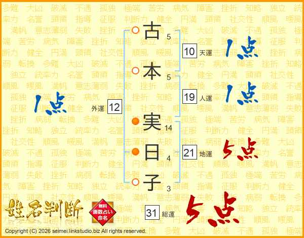 古(5画)本(5画) 実(14画)日(4画)子(3画)