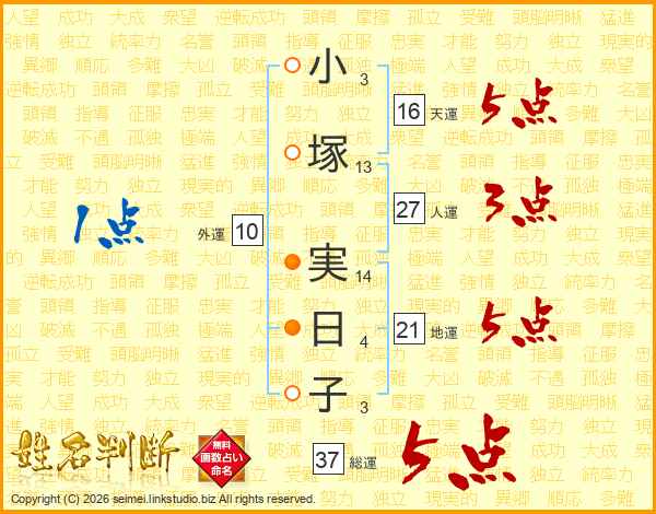 小塚実日子さんの総運は37画の5点!