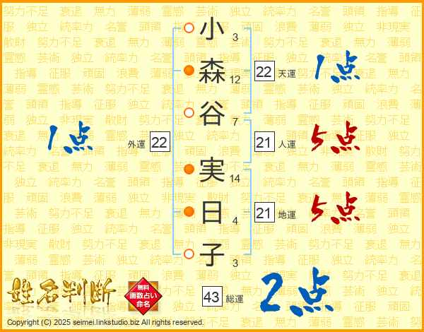小(3画)森(12画)谷(7画) 実(14画)日(4画)子(3画)