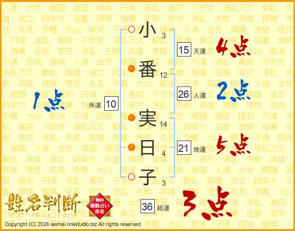 小(3画)番(12画) 実(14画)日(4画)子(3画)