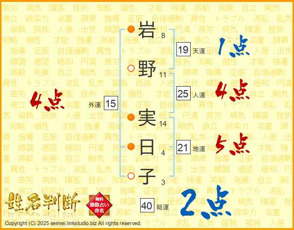 岩(8画)野(11画) 実(14画)日(4画)子(3画)