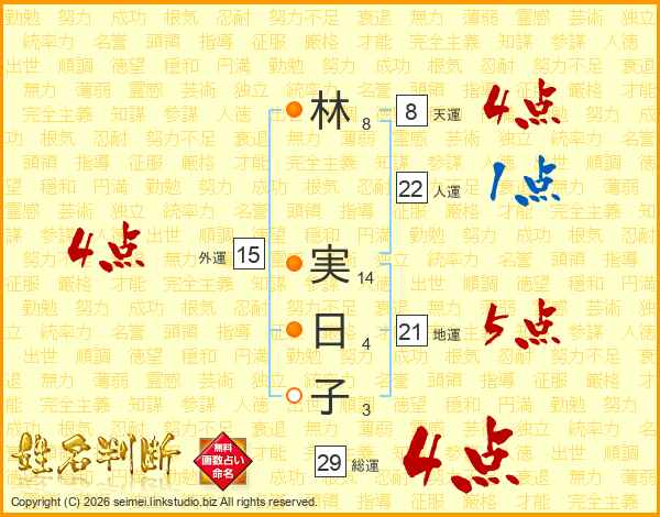 林(8画) 実(14画)日(4画)子(3画)