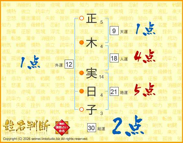 正(5画)木(4画) 実(14画)日(4画)子(3画)