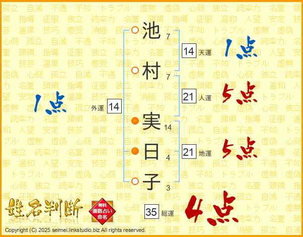 池(7画)村(7画) 実(14画)日(4画)子(3画)
