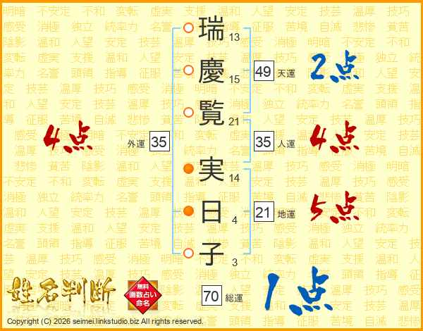瑞(13画)慶(15画)覧(21画) 実(14画)日(4画)子(3画)