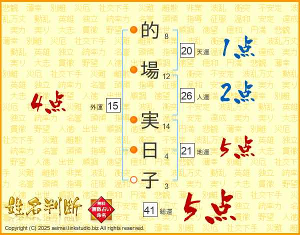 的(8画)場(12画) 実(14画)日(4画)子(3画)