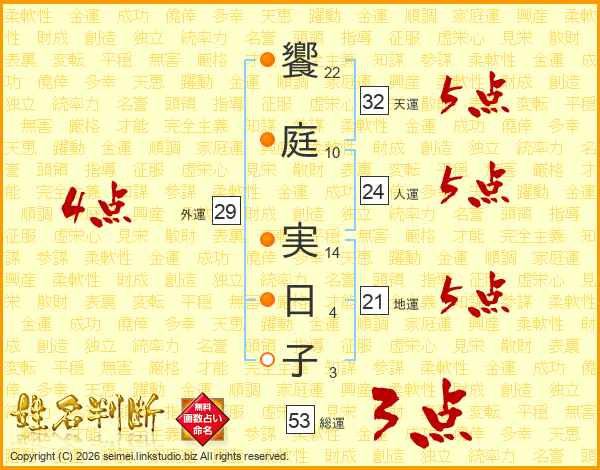 生活面を象徴する運勢です。外部から受ける影響力を表し、結婚運、家庭運や職場、環境への順応性を表します。総運から人運を引いた画数。姓や名が1文字の場合を除く。