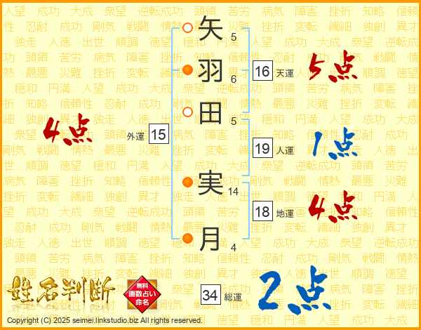 矢(5画)羽(6画)田(5画) 実(14画)月(4画)