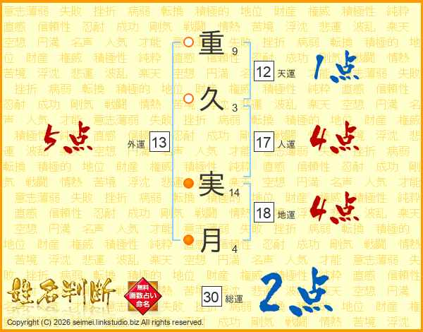 あなたの人生を表す1番重要な運勢です。生涯を通じて影響する総合運となり、主に50歳以降の晩年期に影響を及ぼします。苗字と名前の合計画数。