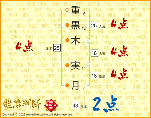 重(9画)黒(12画)木(4画) 実(14画)月(4画)
