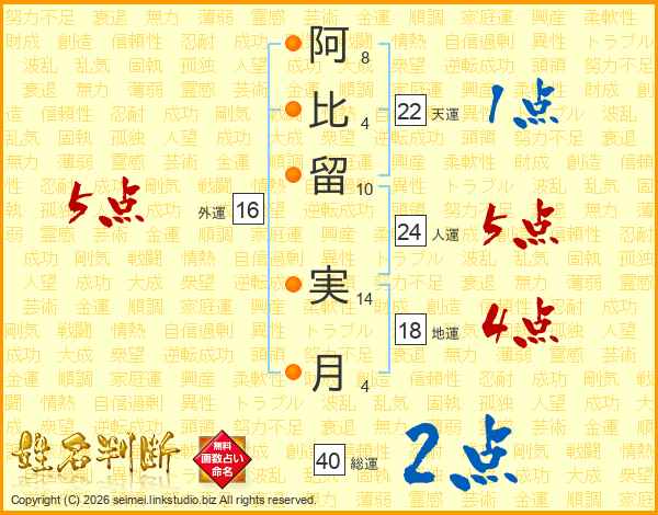 阿(8画)比(4画)留(10画) 実(14画)月(4画)