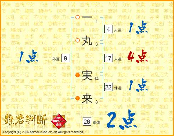 画数の奇数(○陽)と偶数(●陰)の配列で吉凶を占います。どちらかにかたよる名前は大凶名で避ける必要があります。画数の奇数偶数。