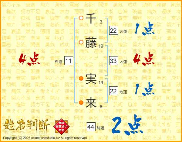 生活面を象徴する運勢です。外部から受ける影響力を表し、結婚運、家庭運や職場、環境への順応性を表します。総運から人運を引いた画数。姓や名が1文字の場合を除く。