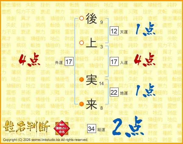 生活面を象徴する運勢です。外部から受ける影響力を表し、結婚運、家庭運や職場、環境への順応性を表します。総運から人運を引いた画数。姓や名が1文字の場合を除く。