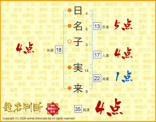 日(4画)名(6画)子(3画) 実(14画)来(8画)