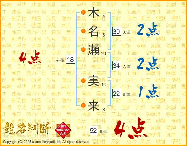 木(4画)名(6画)瀬(20画) 実(14画)来(8画)