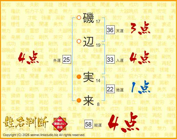 生活面を象徴する運勢です。外部から受ける影響力を表し、結婚運、家庭運や職場、環境への順応性を表します。総運から人運を引いた画数。姓や名が1文字の場合を除く。