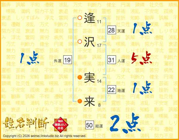 逢(11画)沢(17画) 実(14画)来(8画)