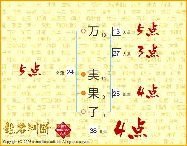 生活面を象徴する運勢です。外部から受ける影響力を表し、結婚運、家庭運や職場、環境への順応性を表します。総運から人運を引いた画数。姓や名が1文字の場合を除く。