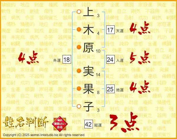 上(3画)木(4画)原(10画) 実(14画)果(8画)子(3画)