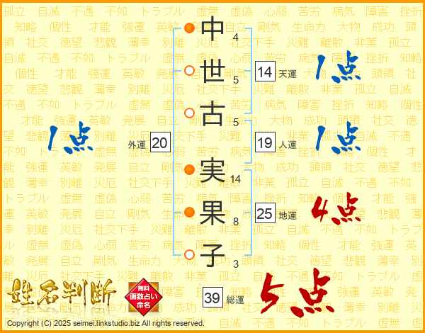 中(4画)世(5画)古(5画) 実(14画)果(8画)子(3画)