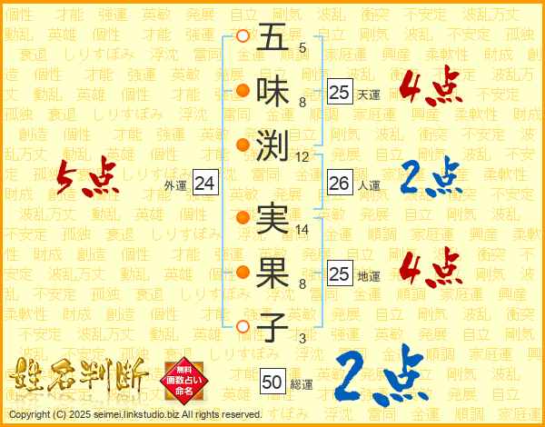 五味渕実果子さんの天運は25画の4点!