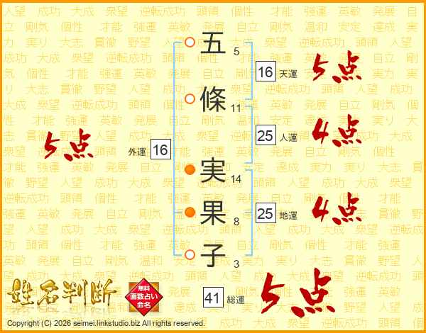 あなたの人生を表す1番重要な運勢です。生涯を通じて影響する総合運となり、主に50歳以降の晩年期に影響を及ぼします。苗字と名前の合計画数。