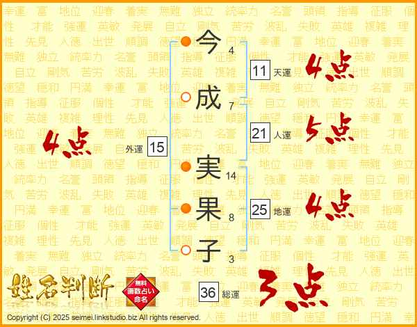 今(4画)成(7画) 実(14画)果(8画)子(3画)