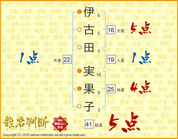 伊(6画)古(5画)田(5画) 実(14画)果(8画)子(3画)