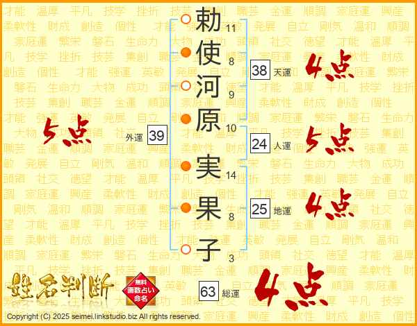 勅(11画)使(8画)河(9画)原(10画) 実(14画)果(8画)子(3画)
