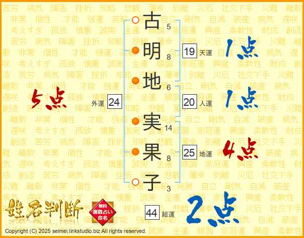 古(5画)明(8画)地(6画) 実(14画)果(8画)子(3画)