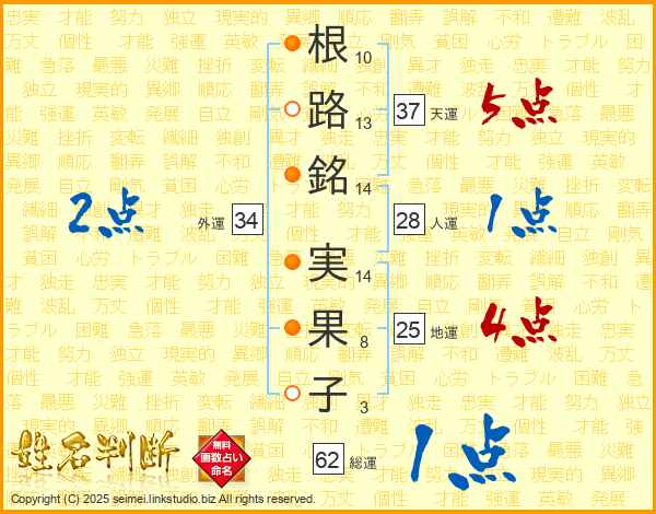 根(10画)路(13画)銘(14画) 実(14画)果(8画)子(3画)