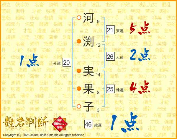 河(9画)渕(12画) 実(14画)果(8画)子(3画)