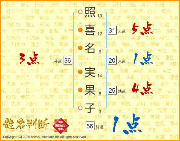 照(13画)喜(12画)名(6画) 実(14画)果(8画)子(3画)