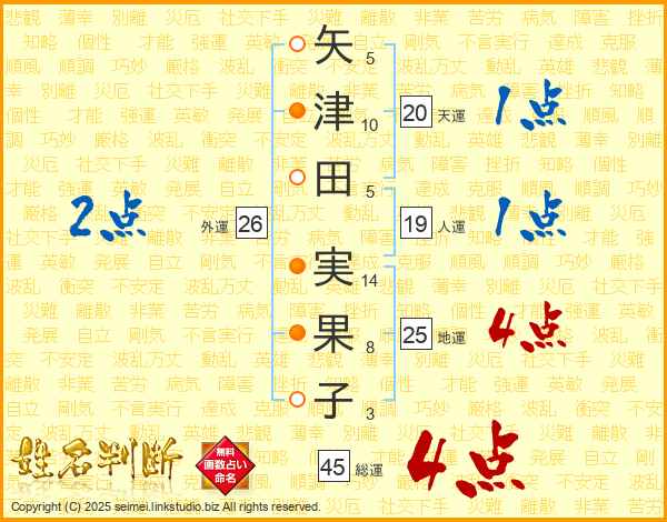 矢(5画)津(10画)田(5画) 実(14画)果(8画)子(3画)