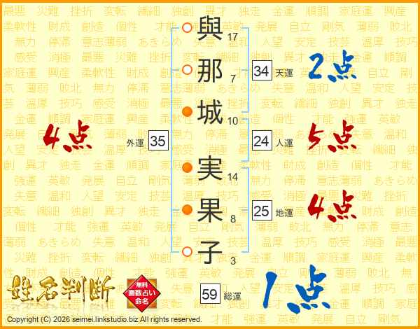 與(17画)那(7画)城(10画) 実(14画)果(8画)子(3画)