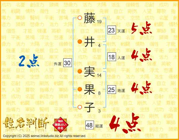 藤(19画)井(4画) 実(14画)果(8画)子(3画)