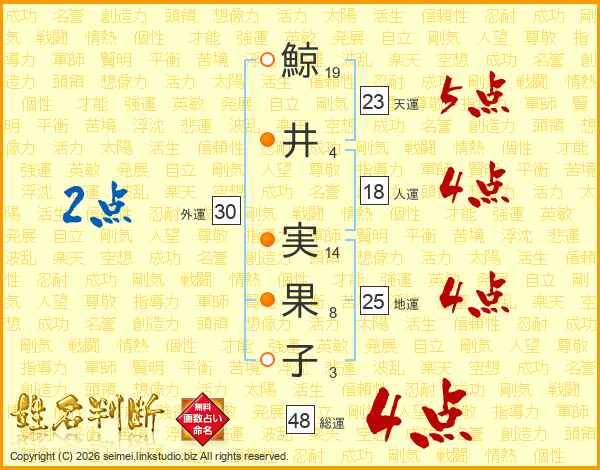 鯨(19画)井(4画) 実(14画)果(8画)子(3画)
