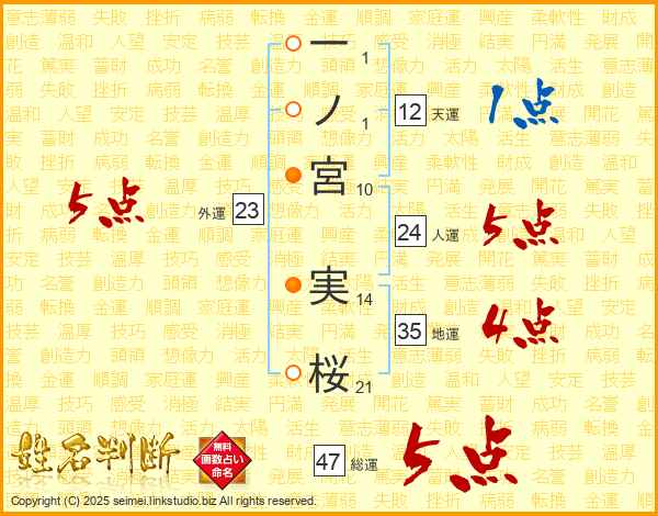 一(1画)ノ(1画)宮(10画) 実(14画)桜(21画)
