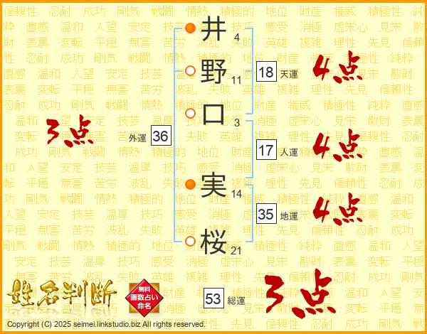 井(4画)野(11画)口(3画) 実(14画)桜(21画)
