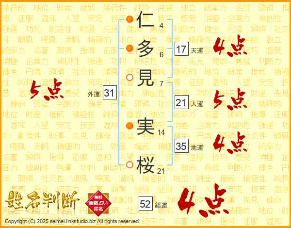 仁(4画)多(6画)見(7画) 実(14画)桜(21画)