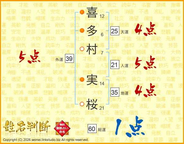 喜(12画)多(6画)村(7画) 実(14画)桜(21画)