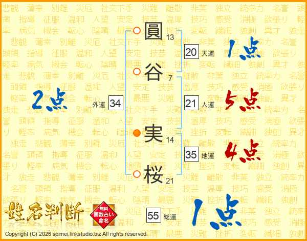 圓(13画)谷(7画) 実(14画)桜(21画)