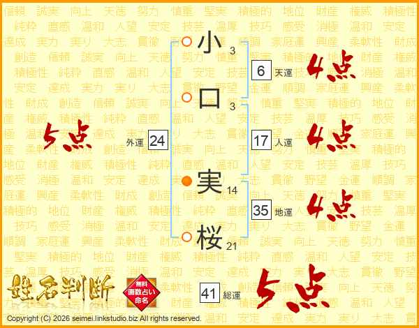 小(3画)口(3画) 実(14画)桜(21画)